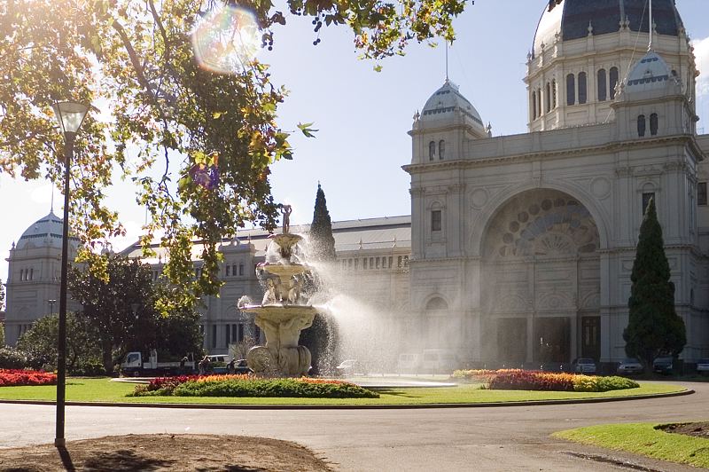 Музей Мельбурна расположен в парке Carlton Gardens, за великолепным зданием Royal Exhibition Building, которое я вам уже показывала. Этот блестящий образец викторианской архитектуры был построен для Всемирной выставки 1881 года. Но я не совсем об этом хотела сказать. День был ветреный, даже очень, и вода из большого фонтана перед Royal Exhibition Building текла, прямо скажем, не так, как обычно: