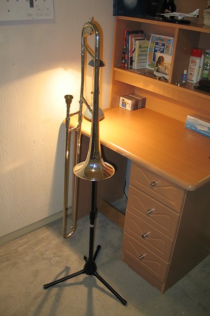 76) Немного играю на блокфлейте, немного на гитаре, выдуваю несколько нот на своем тромбоне.
