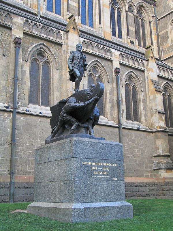 Флиндерс внес большой вклад в исследование и нанесение Австралии на карты, и теперь увековечен в лодке, несомой какими-то бурлаками. Загадочный образ, толковать который можно по-разному.