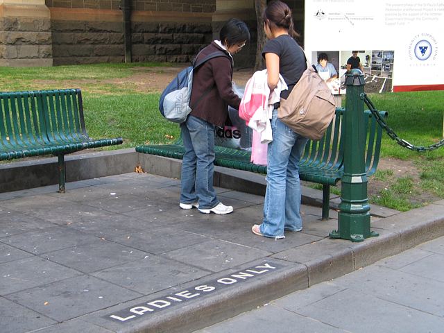 То же самое, впрочем, относится к вот этому объекту. Почему ничем не примечательные лавочки адресованы сугубо дамам (надпись гласит «Только для женщин»), так и осталось для меня загадкой.