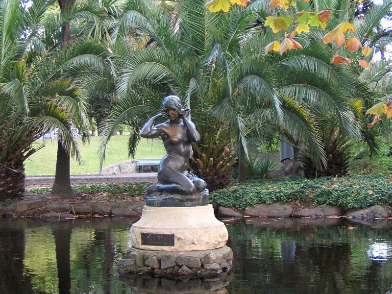 и углубилась в парки. Парки тут переходят один в другой и тянутся длинной зеленой полосой вдоль St Kilda Road. Первый из них – Александровский сад, то есть, простите, Alexandra Gardens, а через дорогу от него – восхитительный Queen Victoria Gardens, мой самый любимый парк в центре Мельбурна. В нем три пруда, водопадики, чудесные растения и множество любопытных скульптур. Например, такая, по имени Genie: