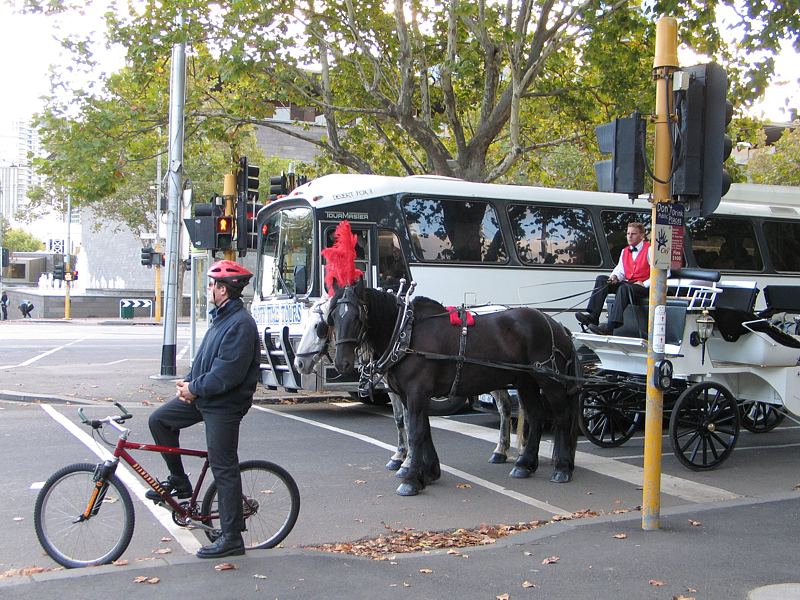День клонился к вечеру, и я направила свои стопы дальше вдоль St Kilda Road. По пути увидела забавную уличную сценку: загорелся красный свет на светофоре, и все разношерстные участники дорожного движения чинно остановились. Четырехногие и двухколесные – не исключение: на дороге все равны.